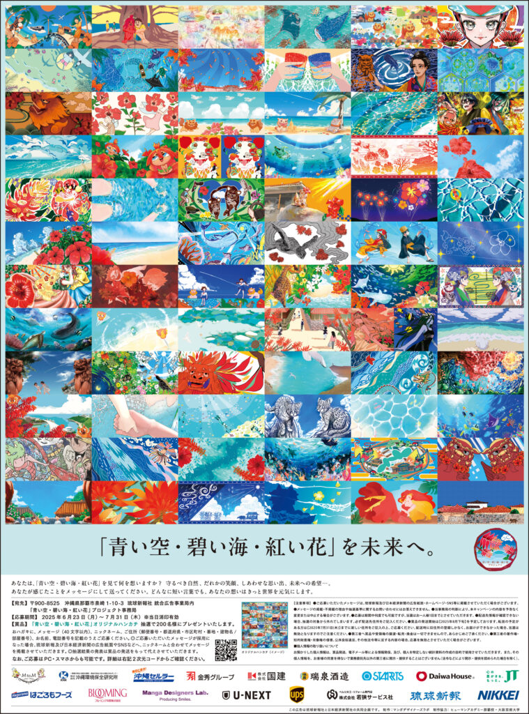 「青い空・碧い海・紅い花」を未来へ。プロジェクトの企画立案、ビジュアル制作に携わりました。戦後80年となる今年2025年6月23日に琉球新報と日本経済新聞に15段全面広告が掲載されました。